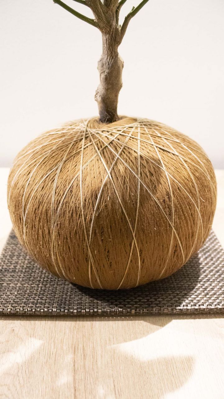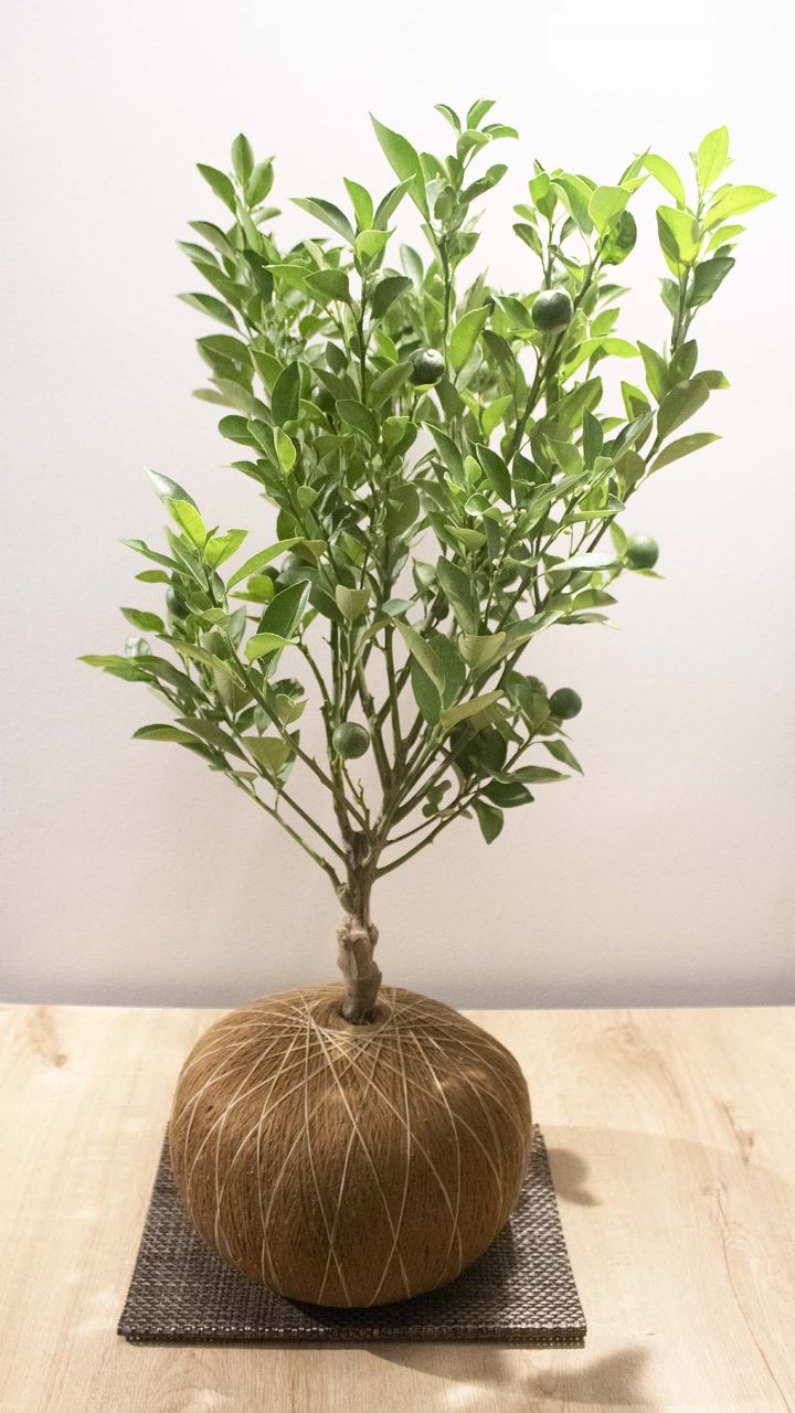 KOEDAMA NARANJO. Kokedama fabricada con base de coco, y forrada en hilos decorativos que evitan que sus raíces dañen el estilo de la planta, utilizamos plantas de interior y exterior, su altura es de 1,30 cms, posee estratos esenciales para el crecimiento de su planta