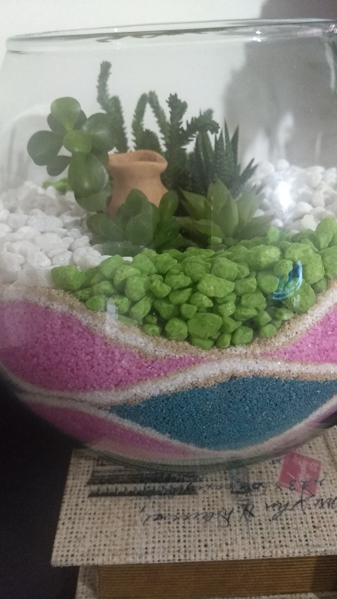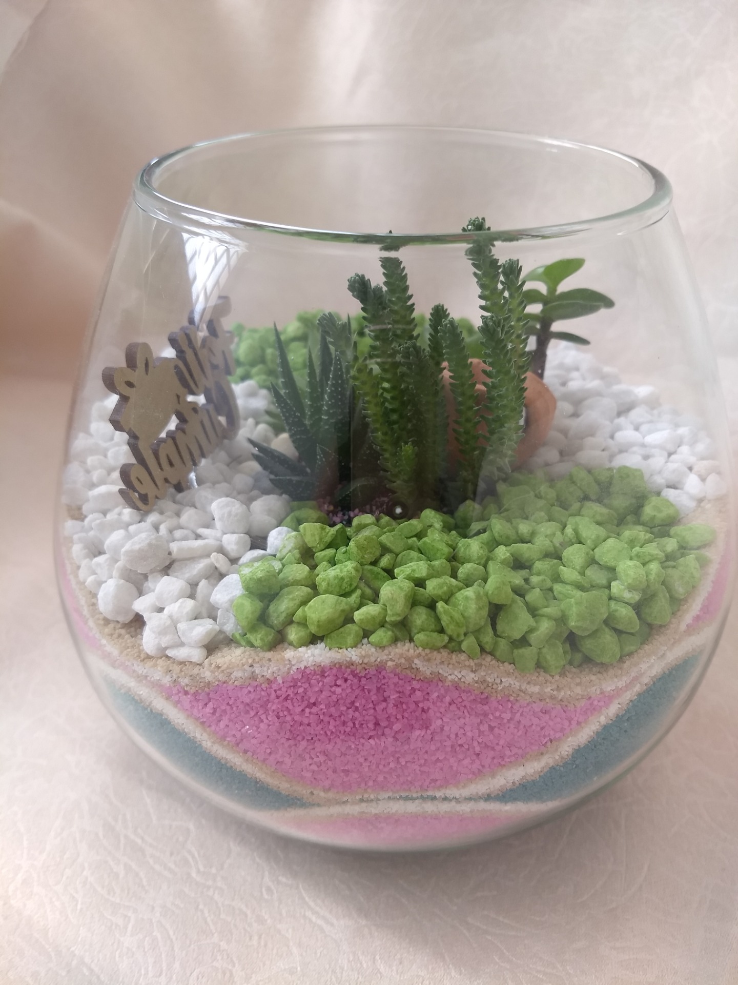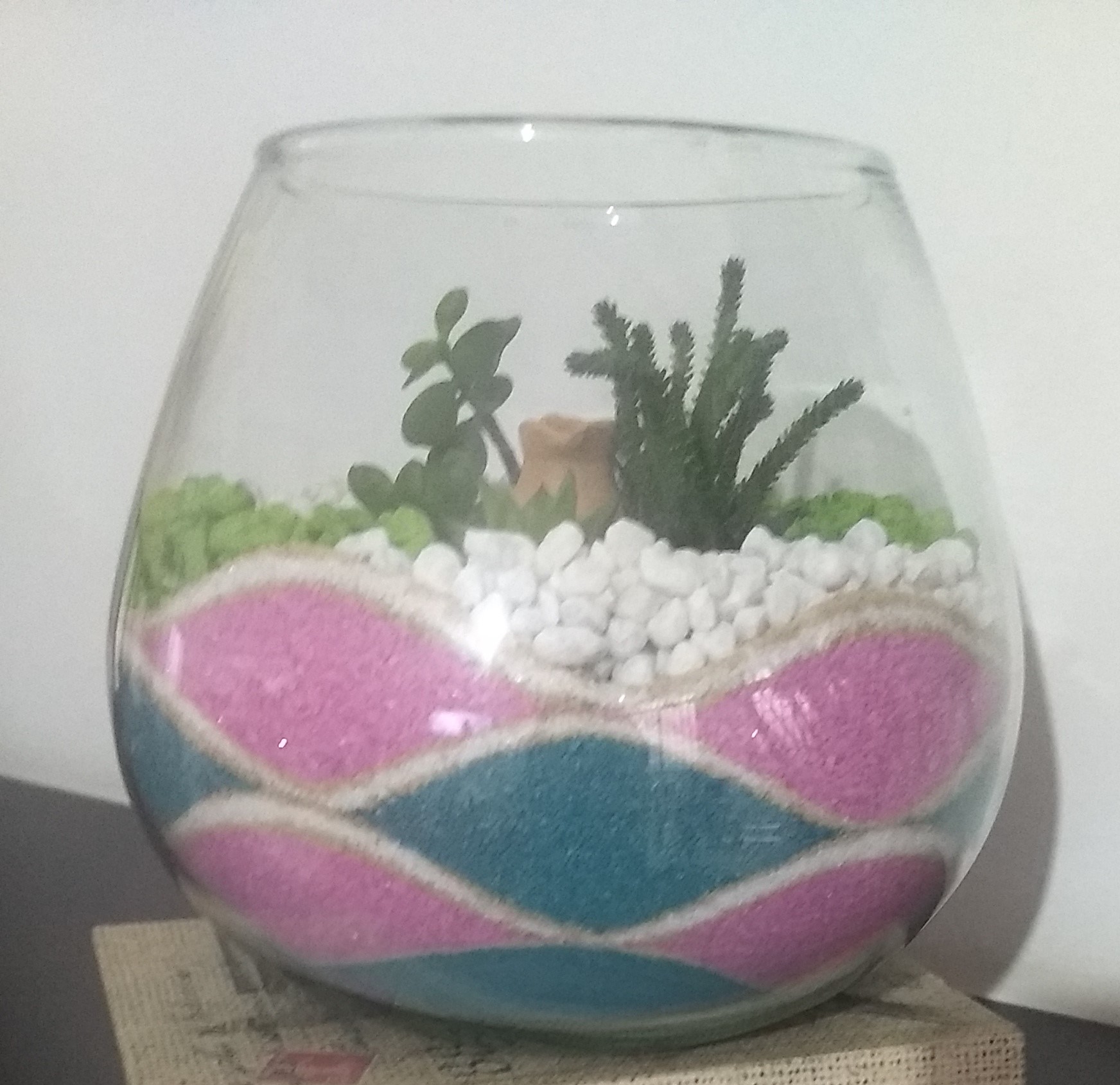 Terrario EIRENE, recipiente en cristal, forma ovoide , altura total de 14 cms y diámetro de boca 10,7cms , diseño y decoración con arena artificial realizados al gusto del cliente.