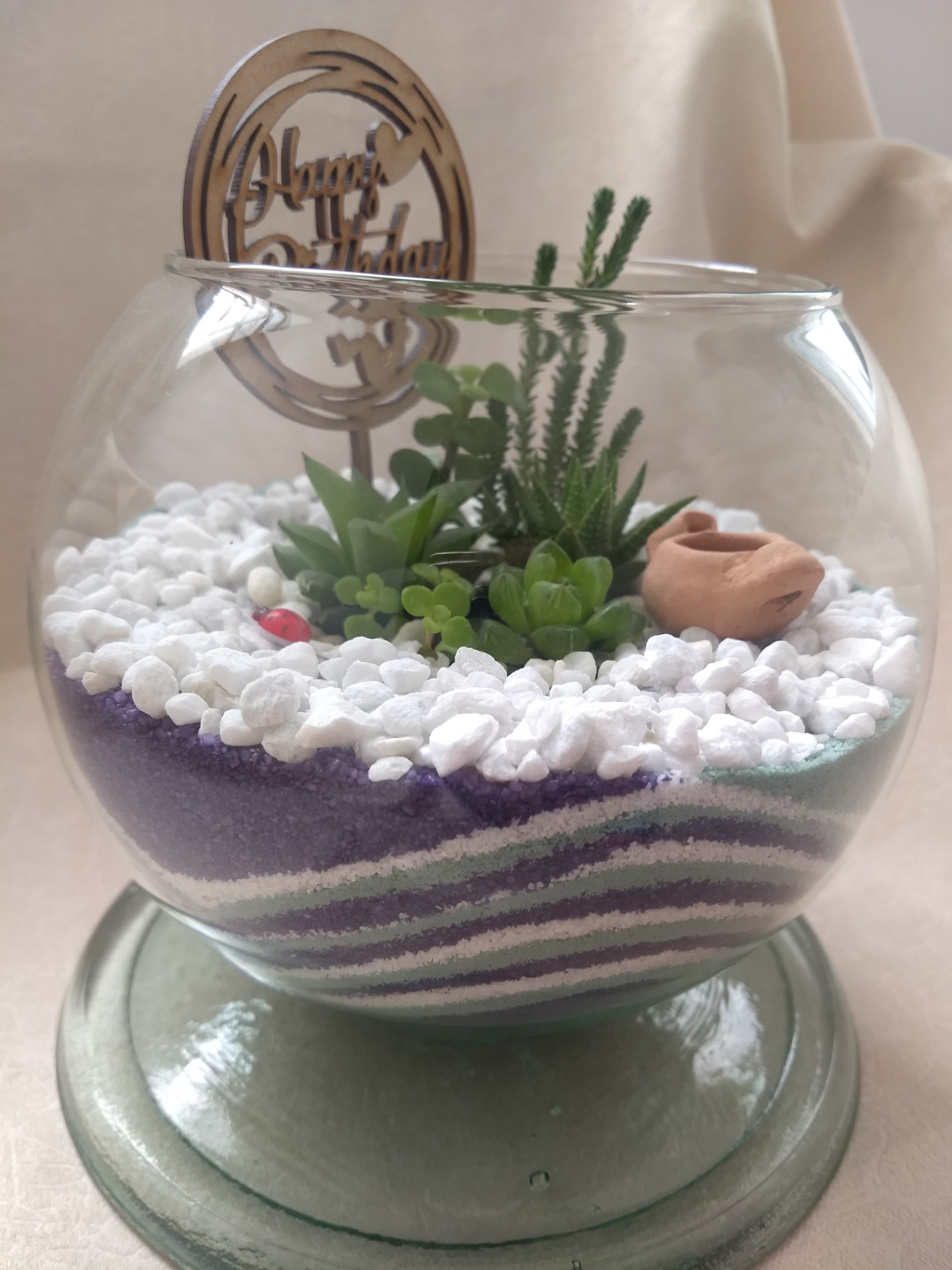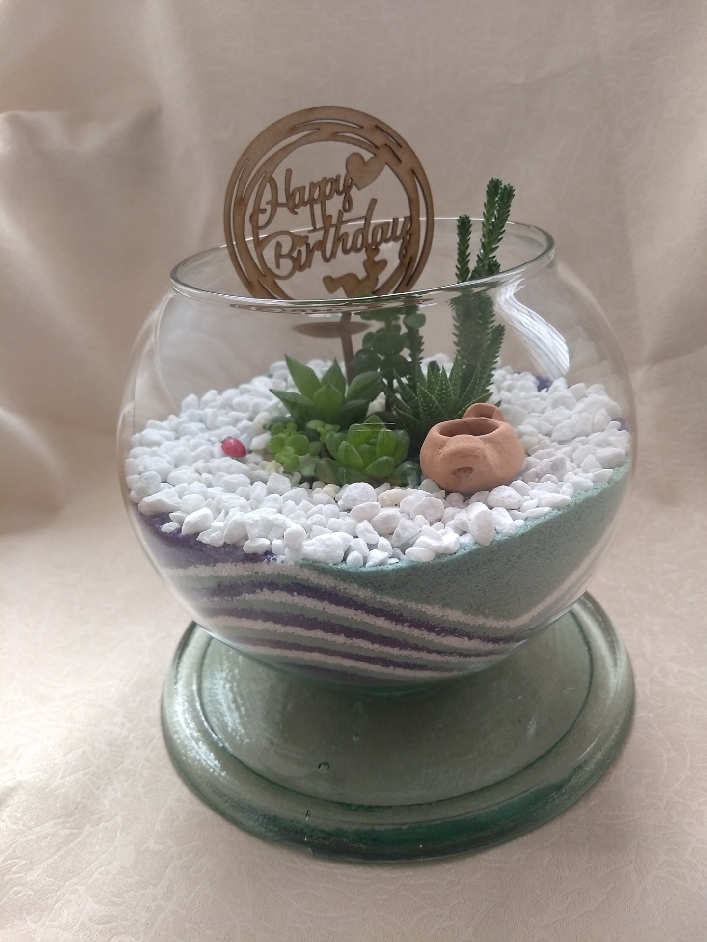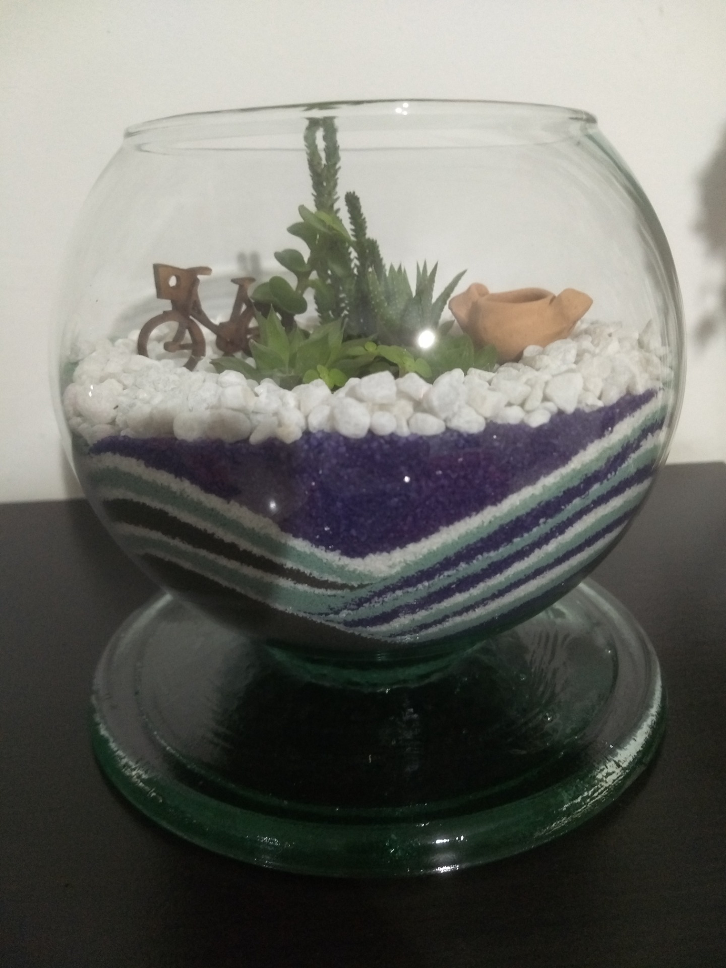 TERRARIO NASHIRA. Estructura y base en cristal, diámetro de boca 11 cms y altura total de 15,3 cms, decoración en arena con diseños elegantes.