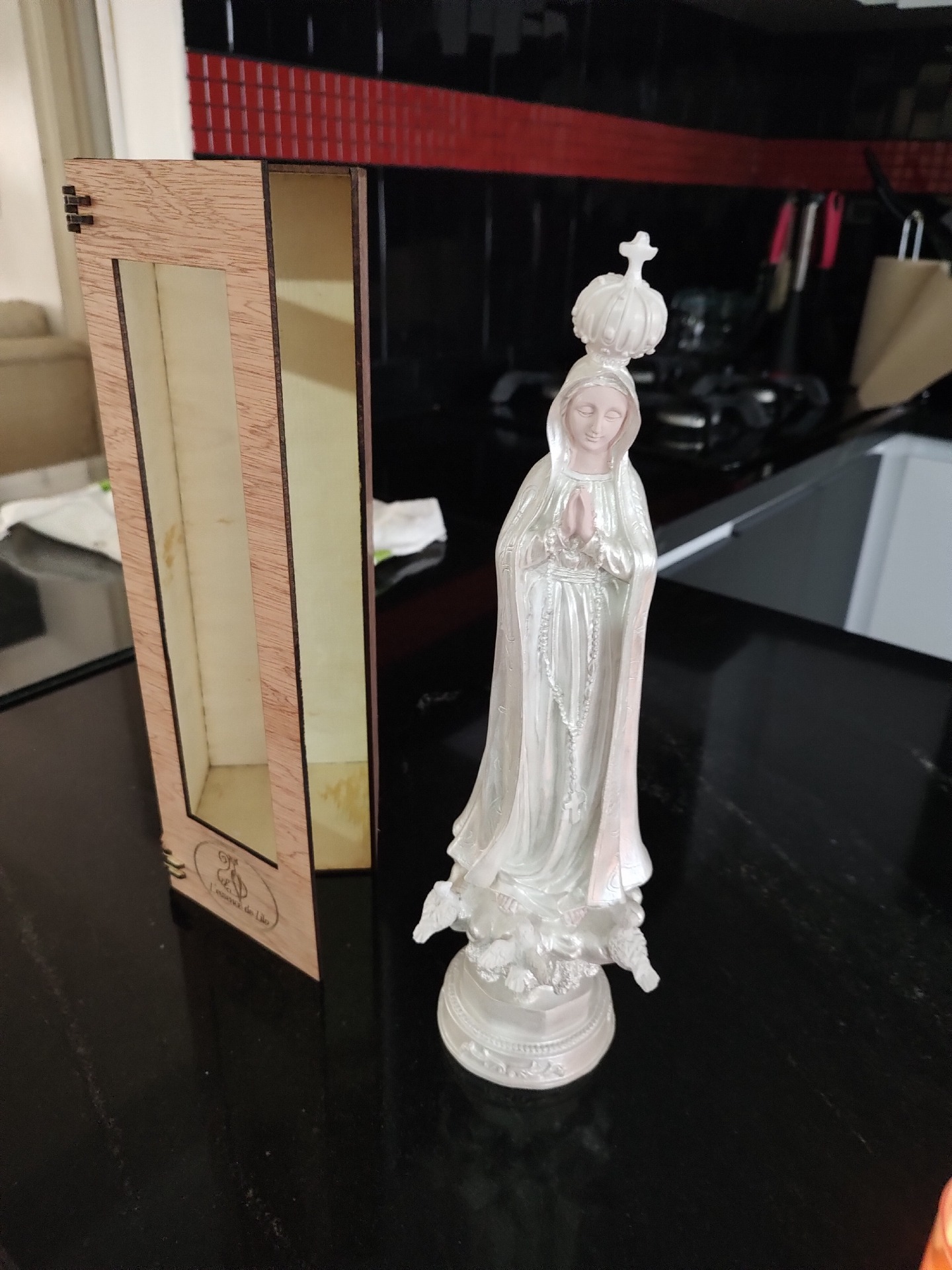 VIRGEN DE FATIMA, hecha en resina, de 32 cms de alto y 10 se ancho por 12 de fondo; los Artículos de nuestra tienda son inspirados en ingenio propio, para su elaboración se utilizan artículos hipoalergénicos, los colores pueden ser a gusto del cliente si así lo desea.